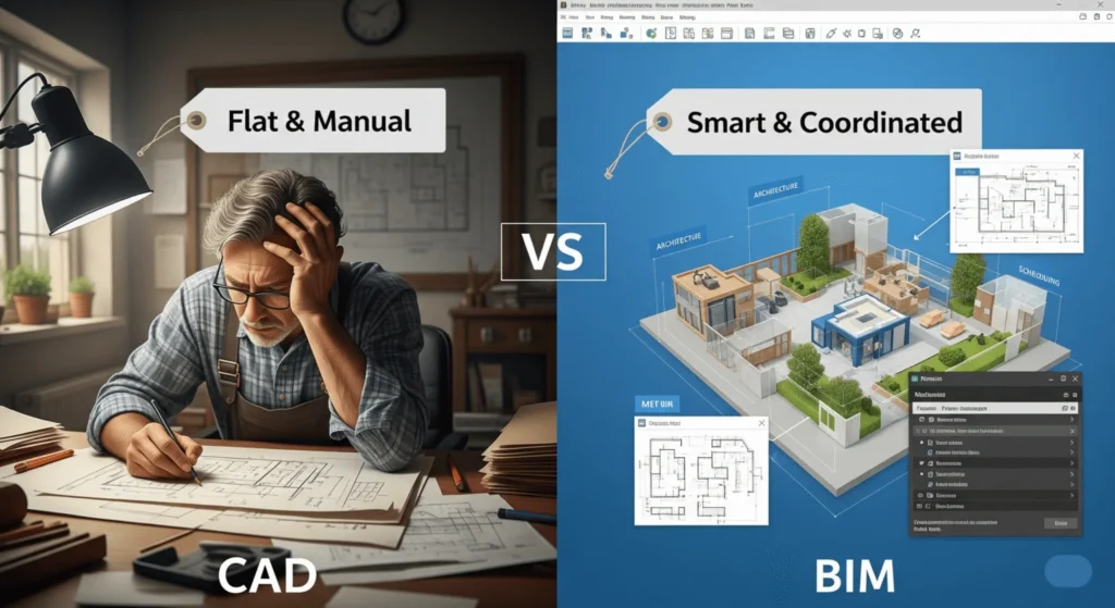 The reason CAD remained dominant for so long was its simplicity. Designers could focus only on lines, text, and layers. But this also meant a lack of coordination and intelligence in the model. When one change happened, it had to be manually updated in every view. This led to mistakes, time loss, and delays, especially in large projects.